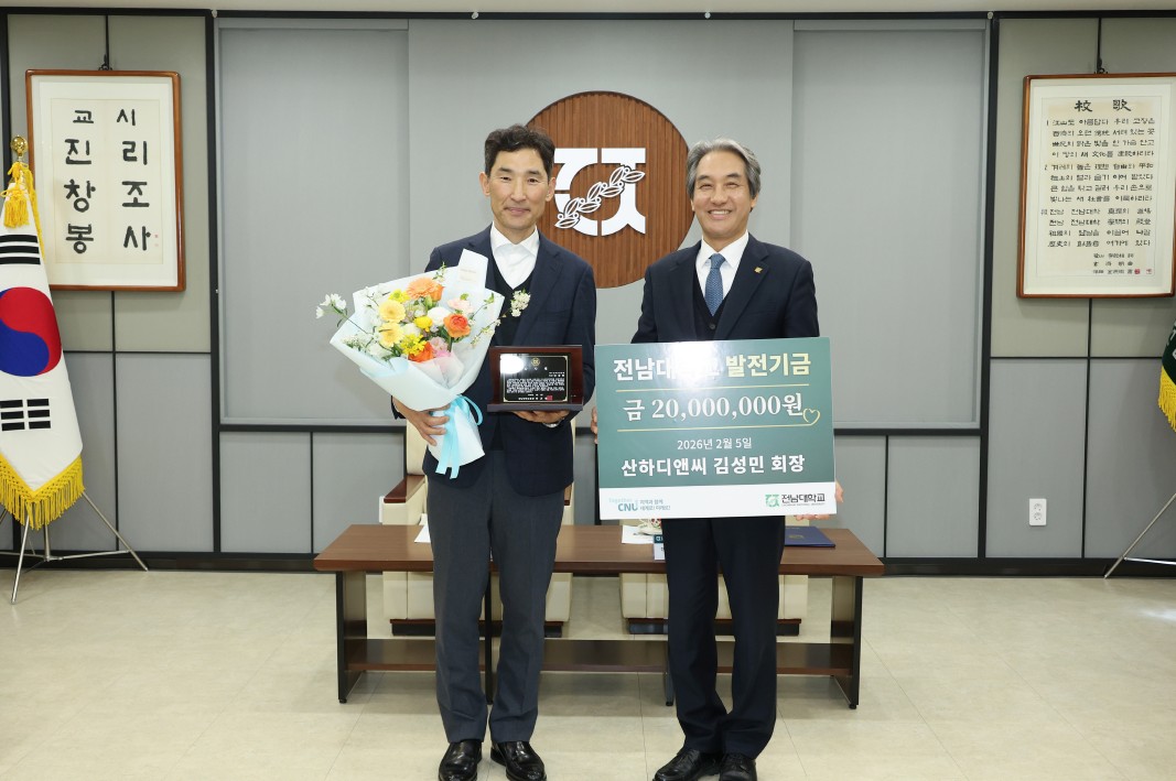 9일 전남대에 따르면 전남대 경영대 무역학과 동문인 김성민 ㈜산하디앤씨 회장이 2월 5일 전남대학교에 인재 양성을 위한 발전기금 2천만 원을 기부했다.