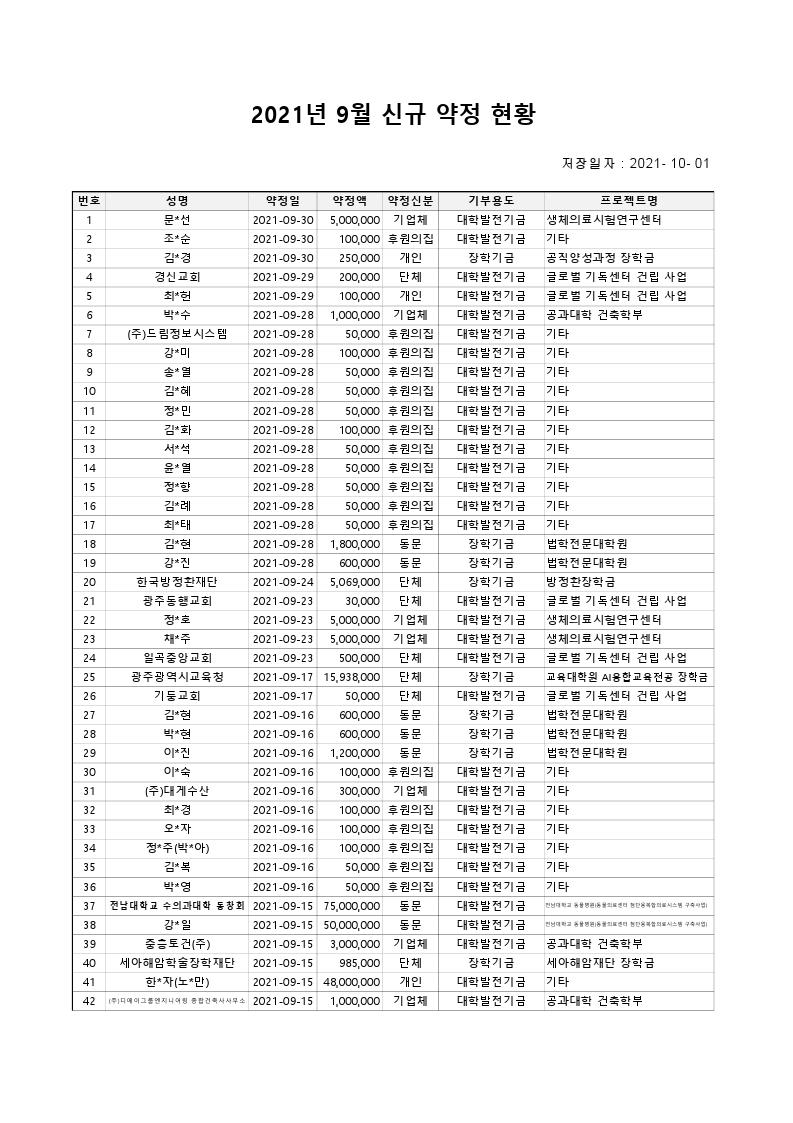 fnctId=bbs,fnctNo=991 글번호 792913 2021년 9월 전남대학교 발전기금 약정 현황 작성일 2021.10.08 수정일 2021.10.08 작성자 양다영 조회수 443 2021년 9월 전남대학교 발전기금 약정 현황 자료를 첨부합니다. 후원해 주신 모든 분께 감사합니다. 첨부파일 (홈페이지용)2021년 9월_신규 약정 현황.pdf 미리보기